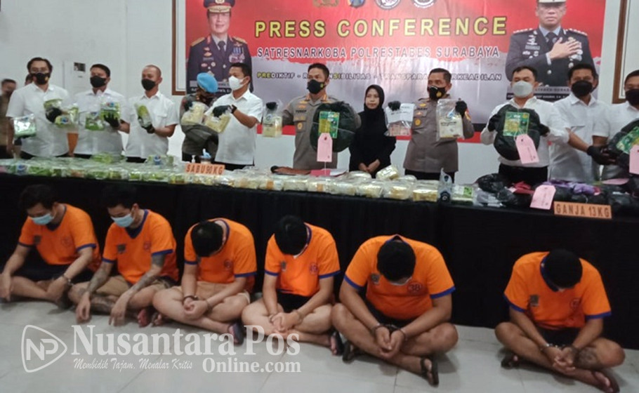 SURABAYA, NusantaraPosOnline.Com-Satresnarkoba Polrestabes Surabaya membongkar jaringan pengedar narkoba di Surabaya. Sebanyal 8 orang pelaku besrta barang bukti 90 Kg Sabu dan 13 Kg Ganja berhasi diamankan.