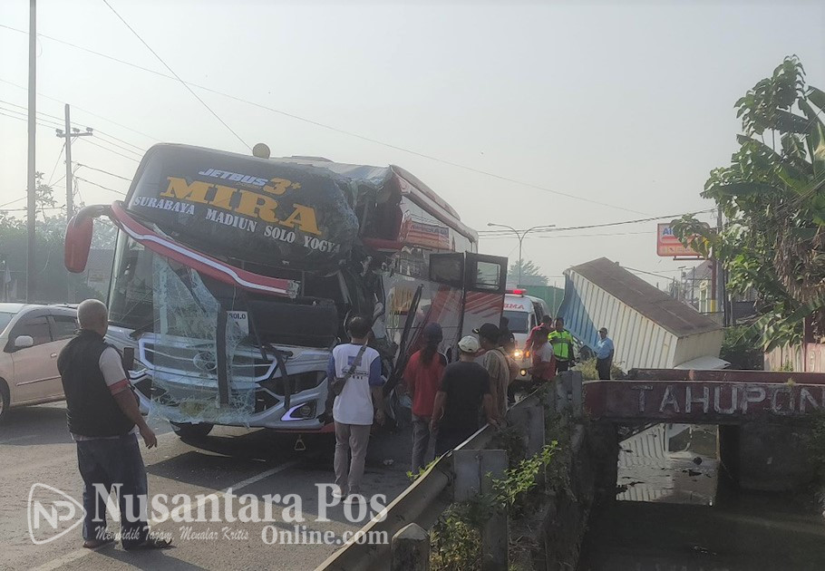 JOMBANG, NusantaraPosOnline.Com-Bus Mira bernopol S 7818 US menabrak bagian belakang Truk Boks yang sedang parkir di bahu jalan nasional ruas Mojoagung-Peterongan, tepatnya di Desa Sambirejo, Kecamatan Jogoroto, Kabupaten Jombang, hingga kedua kendaraan tersebut terperosok ke sungai di sisi jalan. Senin pagi (8/5/2023) sekitar pukul 07.00 WIB.