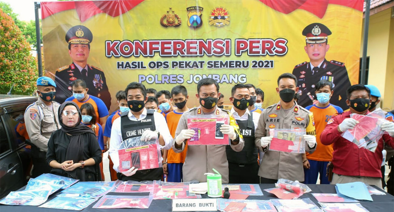 “Dari 159 kasus hasil operasi Pekat, yang berhasil diungkap antara lain 75 kasus premanisme dengan 88 orang tersangka; Judi ada 11 kasus dengan 19 orang tersangka, prostitusi ada 2 kasus dengan 2 tersangka, miras ada 44 kasus dengan 46 tersangka, narkoba ada 26 kasus dengan 29 orang tersangka, street crime ada 1 kasus dengan 3 orang tersangka,” Kata Kapolres Jombang, AKBP Agung, saat menggelar kegiatan konferensi pers di Mapolres Jombang, terkait hasil operasi Semeru 2021. Selasa (06/04/2021).