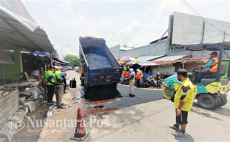 JOMBANG, NusantaraPosOnline.Com-Dinas PUPR Kabupaten Jombang telah memperbaiki ruas Jalan KH Mimbar, yang ada di belakang Pasar Legi Citra Niaga Kabupaten Jombang. Jalan tersebut diduga rusak akibat padatnya arus lalu lintas, sehingga jalan cepat mengalami kerusakan.