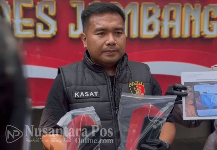 FOTO : Kasatreskrim Polres Jombang AKP Dimas Robin Alexander dalam Konferensi pers, di Mapolres Jombang, pada Selasa (21/4/2026), menunjukan sejumlah barang bukti kasus pembunuh pria yang jasadnya ditemukan di kecamatan megaluh Jombang.