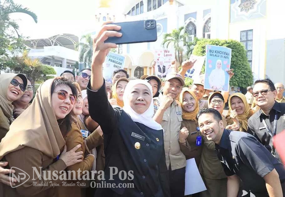 Gubernur Jawa Timur Khofifah Indar Parawansa dan Wagub Jawa Timur Emil Elestianto Dardak bersama pegawai Pemrov Jatim foto selfie, bersama ASN di lingkungan sekretariat daerah provinsi Jawa Timur di Jalan Pahlawan Nomor 110 Surabaya. Senin (12/2/2024).