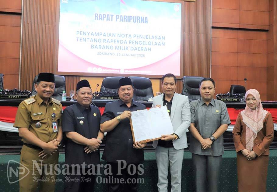 JOMBANG, NusantaraPosOnline,Com-emerintah Kabupaten Jombang resmi mengajukan Rancangan Peraturan Daerah (Raperda) tentang Pengelolaan Barang Milik Daerah (BMD) dalam Rapat Paripurna Dewan Perwakilan Rakyat Daerah (DPRD) Kabupaten Jombang, Senin (26/1/2026) pagi, dengan agenda  Penyampaian Nota Penjelasan tentang Raperda Pengelolaan Barang Milik Daerah, dan Penetapan Perubahan Propemperda Tahun 2026 di Ruang Rapat DPRD Kabupaten Jombang.