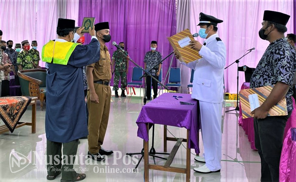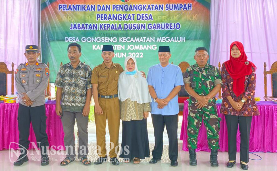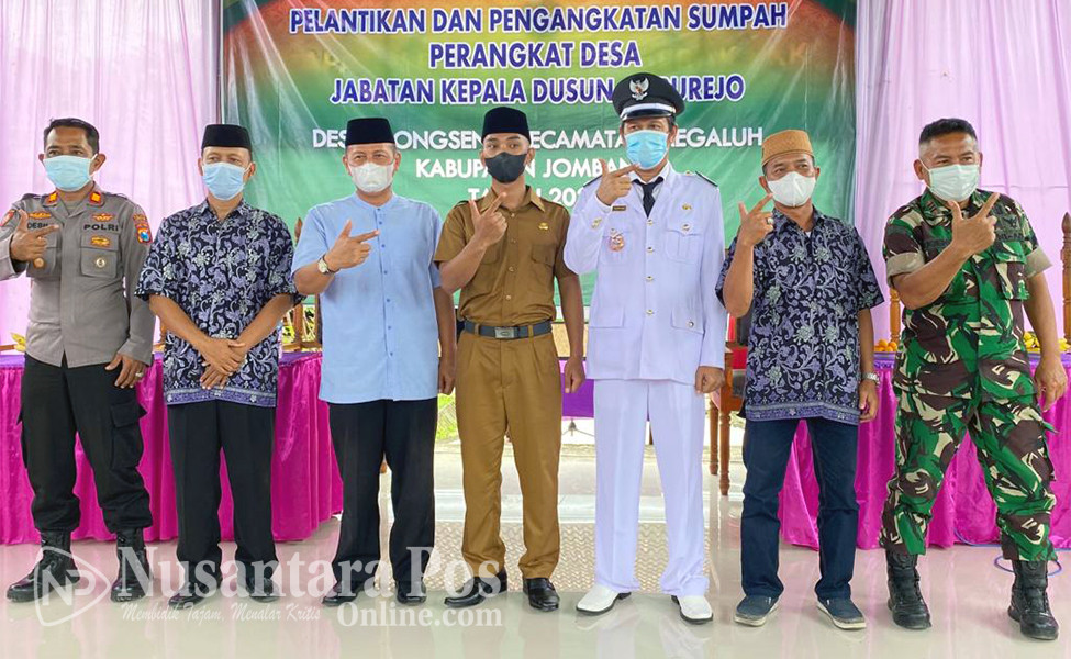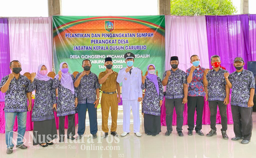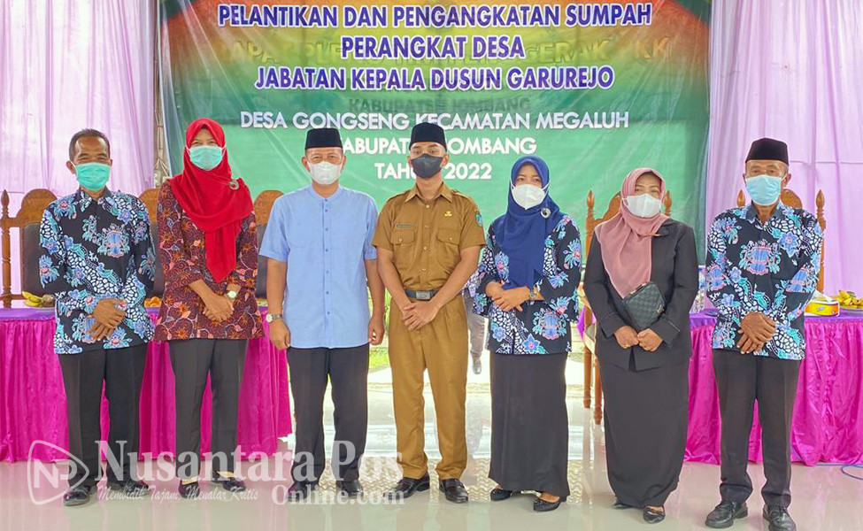 JOMBANG, NusantaraPosOnline.Com-Kepala Desa (Kades) Gongseng, Kecamatan Megaluh, Kabupaten Jombang Jawa timur, Ahmad Supriyadi, hari ini secara resmi melakukan Pengambilan Sumpah Jabatan dan Pelantikan Perangkat Desa baru desa Gongseng atas nama Anas Maulana sebagai Kepala dusun (Kasun) Garurejo Desa Gongseng. Sabtu pagi (5/2/2022).