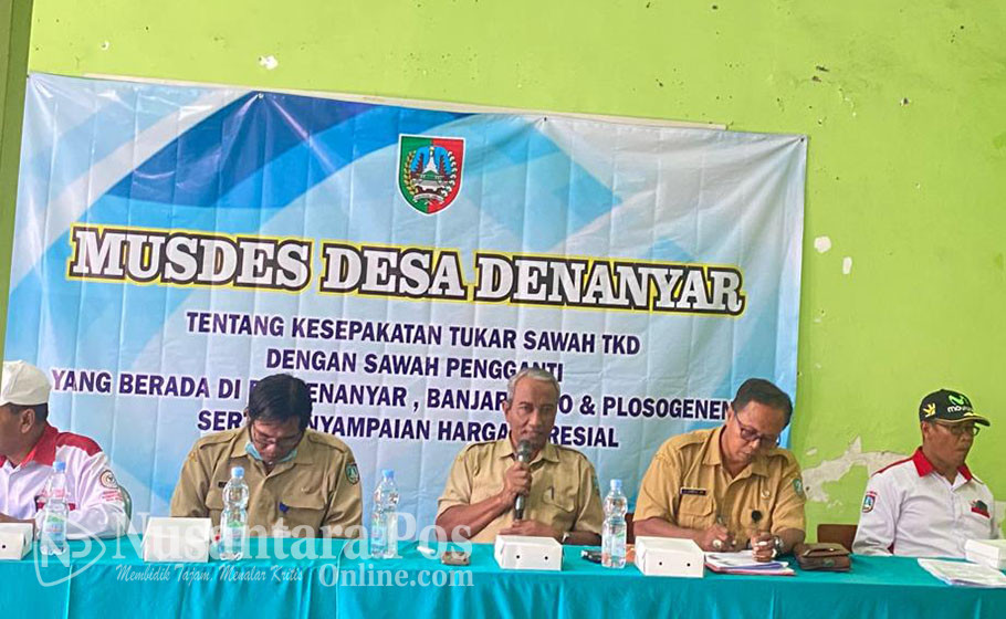 JOMBANG-Pemerintahan Desa Denanyar, Kecamatan / Kabupaten Jombang Melaksakan Musdes (Musyawarah Desa) dengan agenda tentang Kesepakatan Tukar tanah sawah TKD (Tanah kas desa) Desa Denanyar, dalam rangka mendukung rencana pemerintah kabupaten Jombang, untuk membangun pasar baru di wilayah setempat.