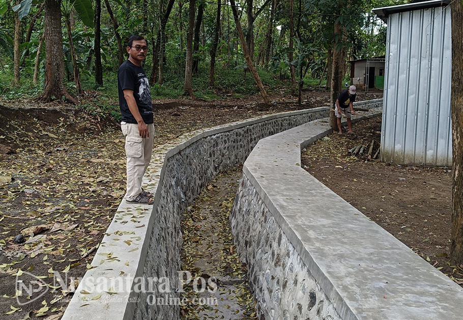 Tembok penahan tanah (TPT) dikawasan destinasi wisata Sendang Made, Desa Made, Kecamatan Kudu, Jombang, yang dibangun dari program BKK tahun 2025. Senin (29/7/2025).