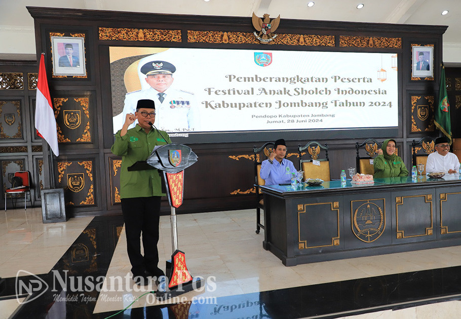 JOMBANG, NusantaraPosOnline.Com-Pemberangkatan Kafilah Kabupaten Jombang ke Jember untuk mengikuti Festival Anak Sholeh Indonesia (FASI) XII Tingkat Provinsi Jawa Timur 2024 dari Pendopo Kabupaten Jombang pada Jumat (28/6/2024) pagi, dilepas langsung oleh Pj Bupati Jombang Sugiat didampingi Pj Ketua Tim Penggerak PKK Kabupaten Jombang Yayuk Dwi Irawanti Sugiat.