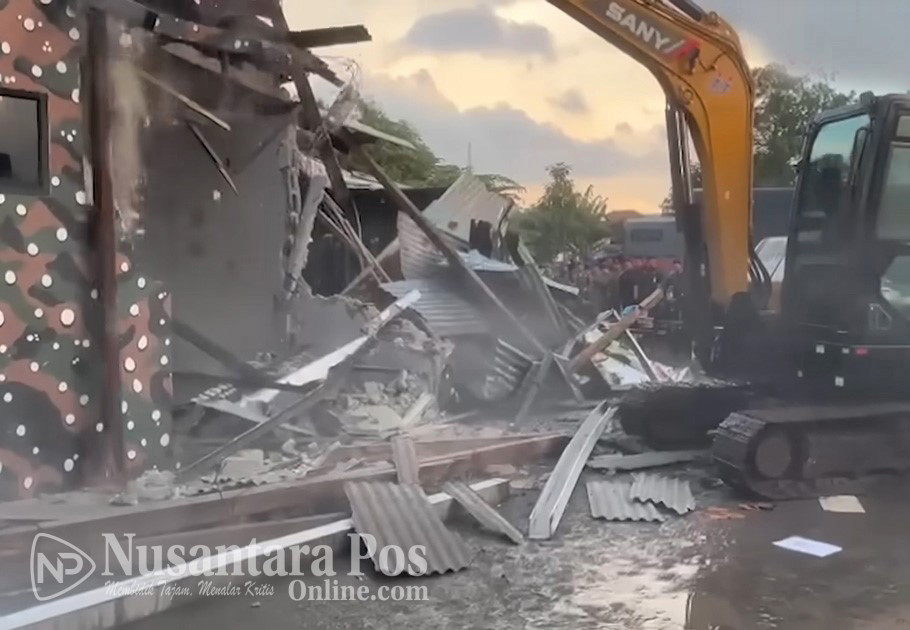 Selanjutnya bangunan berukuran 4×4 meter persegi itu, dibongkar menggunakan ekskavator hingga rata dengan tanah.