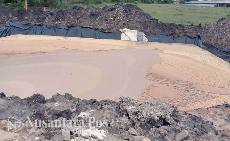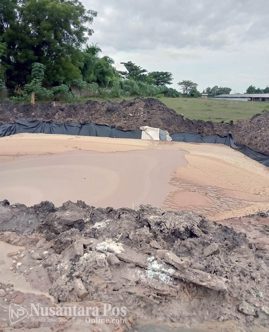 Kolam limbah bangkai ayam PT SUR 3 desa Balongsari, yang sedang dilakukan penyedotan atau penanganan. Selasa (25/1/2022)