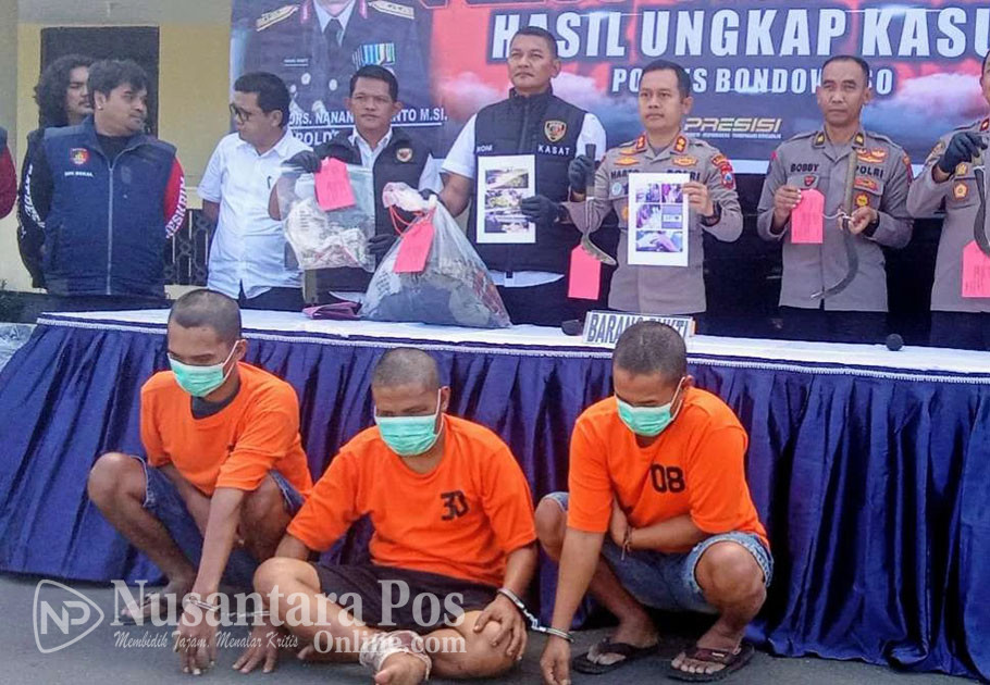 BONDOWOSO, NusantaraPosOnline.Com-Pelarian tiga pelaku pencurian dengan kekerasan (curas) di sebuah ladang tembakau di Desa Mengen, Kecamatan Tamanan, Kabupaten Bondowoso, akhirnya terhenti ditangan Satuan Reserse Kriminal (Satreskrim) Polres Bondowoso. Ketiganya ditangkap tanpa perlawanan, setelah sempat menjadi buronan polisi sejak akhir Agustus 2024.